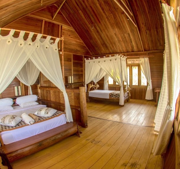 Colchões ortopédicos, lençóis 400 fios, ar condicionado, frigobar, água quente no banheiro privativo e decoração com iluminação diferenciada, garantem o bem-estar e o conforto dos hóspedes. Todo o mobiliário foi feito no resort da ilha com madeira encontrada na praia garantindo um design rústico e único.